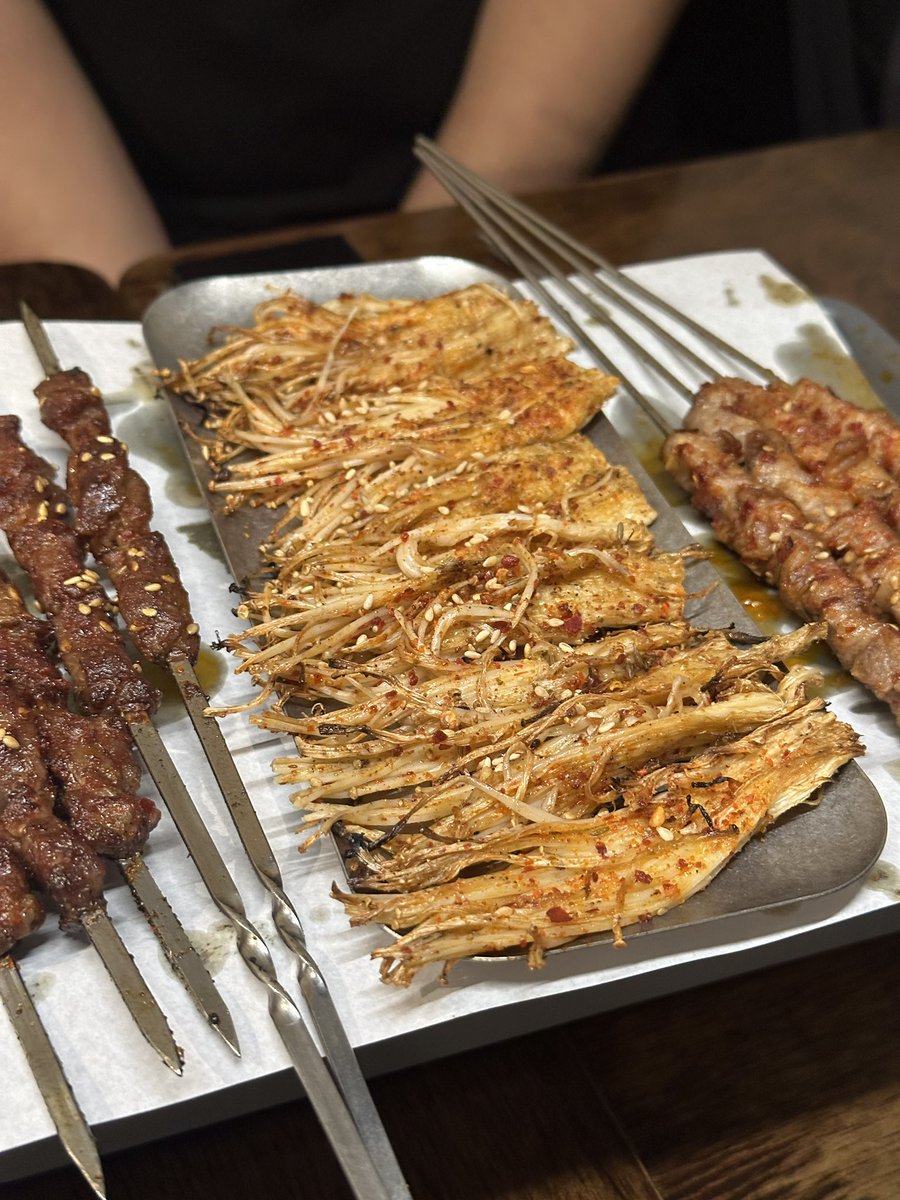 홍대 <숨은꼬치>. 구워져서 서빙되는 양꼬치. 양고기가 당기지만 옷에 냄새가 배는 게 싫다면 고를 수 있는 선택지 중 꽤 윗쪽에 있다고 할 수 있음. 고기도 괜찮고, 만두와 버섯도 이런 종류의 음식에서 기대할 수 있는 정확한 그 지점을 포착한 맛이다. 깔끔한 저녁으로 아주 괜찮아!